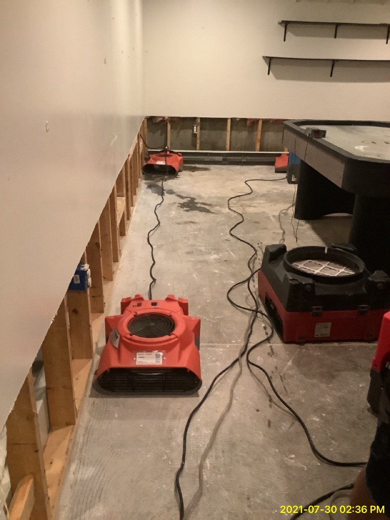 Customer had a hot water tank let go. we arrived onsite and extracted all the water. We then preformed mitigation service. removed walls at 2 foot for about 75% of the basement living area. We then placed equipment to dry out the framing and air by placing dehumidifier and fans.